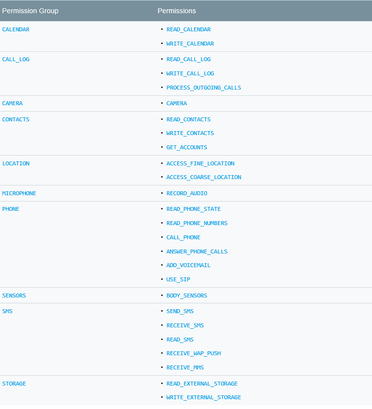 可以看到android把危险权限分为10组,所以申请危险权限的时候都是按组申请,我们只要申请组内的任意一个危险权限就行,当用户一旦同意授权该危险权限,那么该权限所对应的权限组中的所有其他权限也会同时被授权。