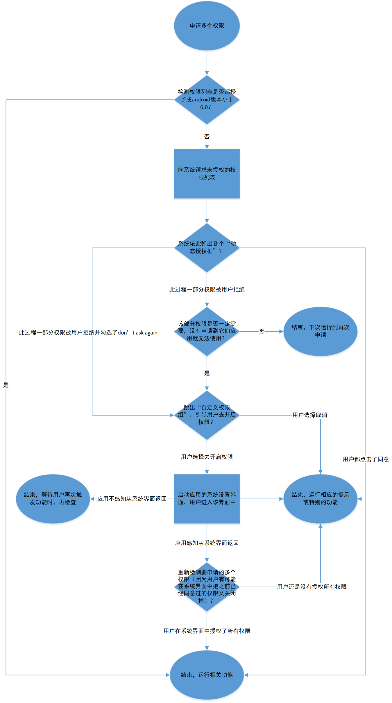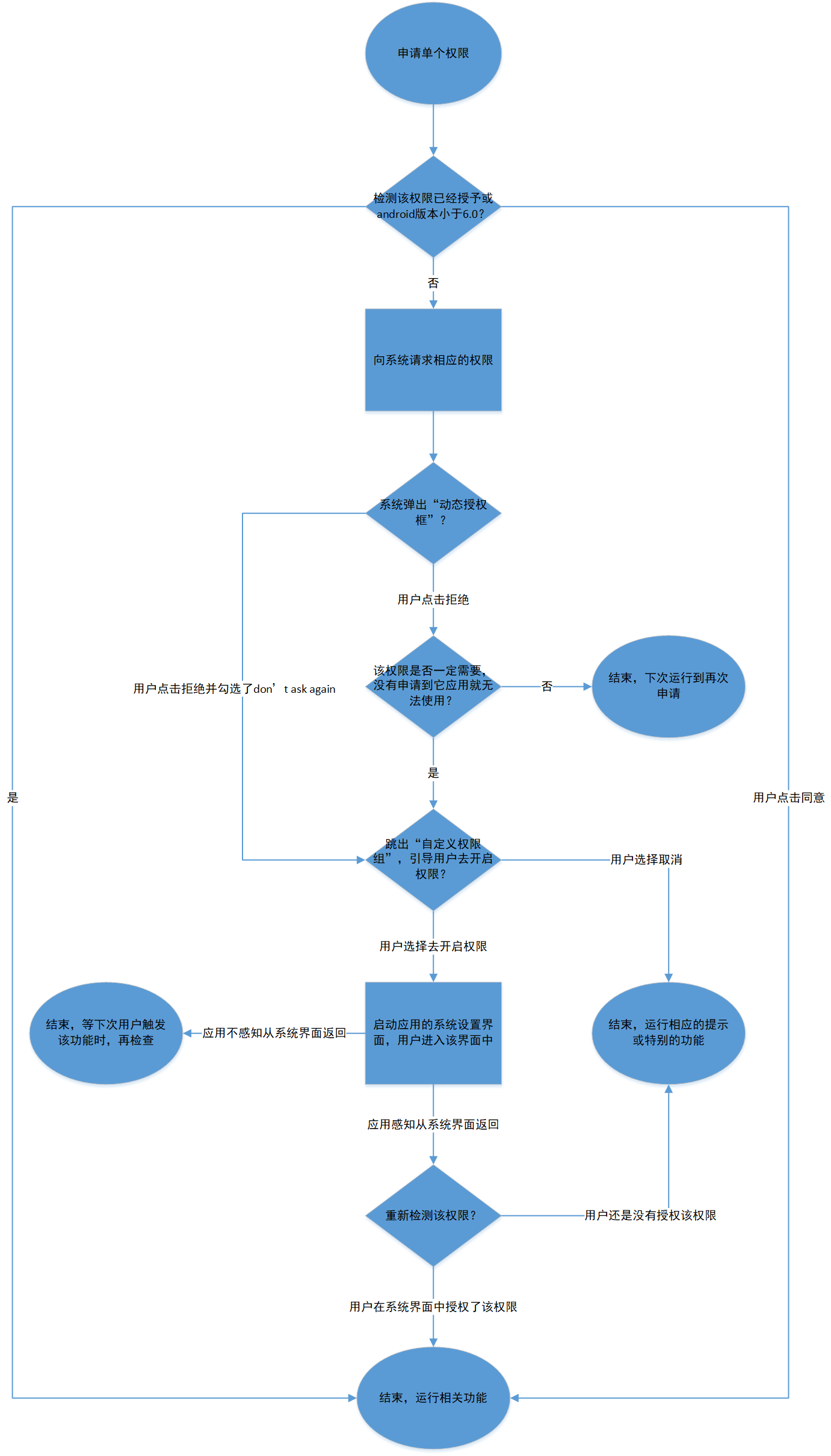 我这里讨论的是6.0后的动态申请,所以从 Android 6.0开始,无论您的应用面向哪个 API 级别,您都应对应用进行测试,以验证它在缺少需要的权限时行为是否正常,我把权限申请的流程分为单个和多个权限申请,分别画了个图。